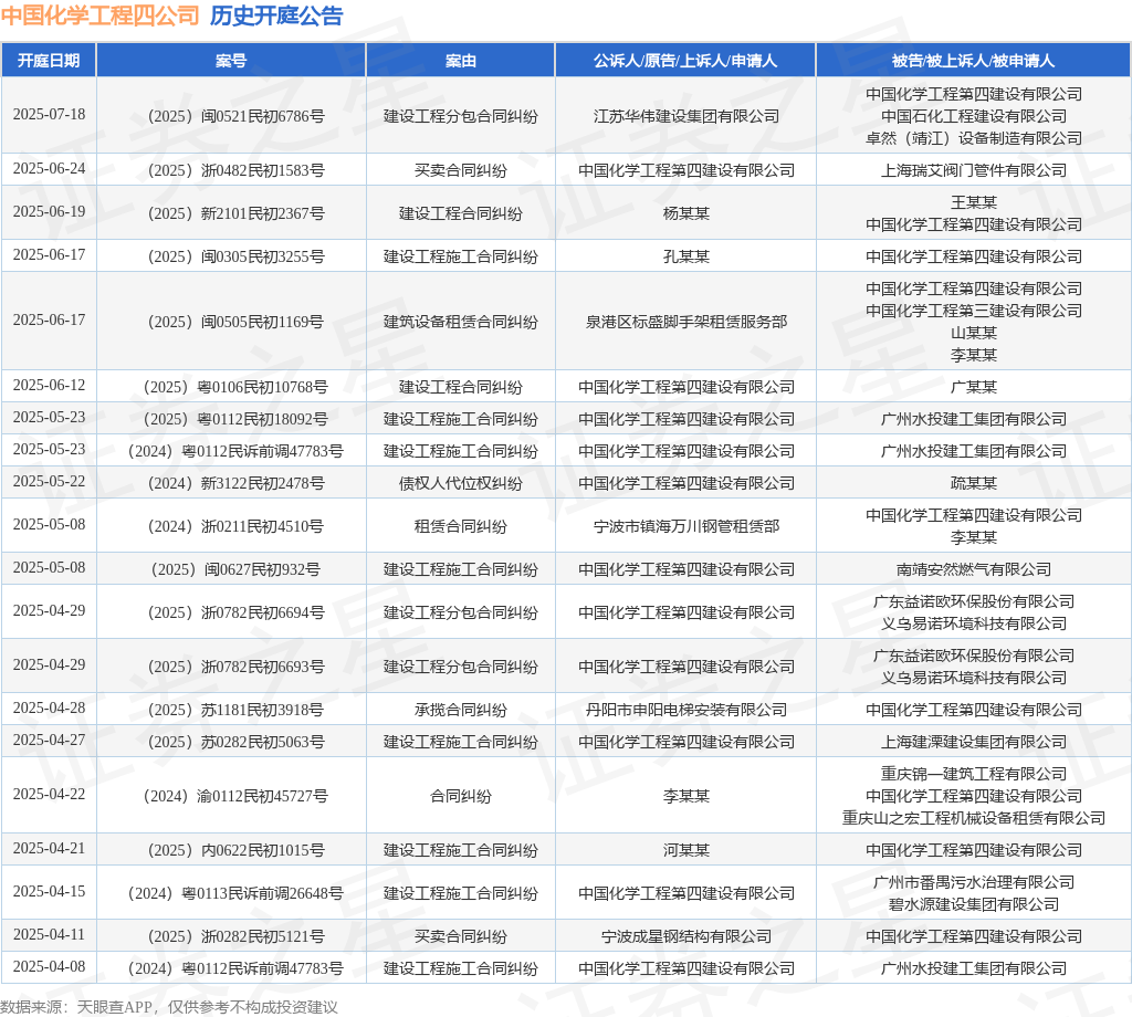 发布日期:2025-06-25 16:03 点击次数:142本站消息,根据天眼查APP显示,近日公布了一则中国化学工程第四建设有限公司作为原告/上诉人的开庭公告,详细内容如下: